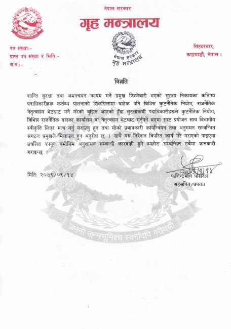 शान्ति सुरक्षा तथा अमनचयन कायम गर्ने प्रमुख जिम्मेवारी भएको सुरक्षा निकायका कतिपय पदाधिकारीहरू कर्तव्य पालनाको सिलसिलामाबाहेक विभिन्न कुटनैतिक नियोग, राजनैतिक नेतृत्वसँग भेटघाट गर्ने गरेको भन्दै गृहमन्त्रालयले सुरक्षाकर्मी र पदाधिकारीहरूले कुटनैतिक नियोग, विभिन्न राजनीतिक दलका कार्यालय वा नेतृत्वसँग भेटघाट गर्नुपर्ने भएमा स्पष्ट प्रयोजन साथ विभागीय स्वीकृति लिन निर्देशन दिएको हो। अन्यथा विभागीय कारबाही हुने गृहले चेतावनीसमेत दिएको छ।